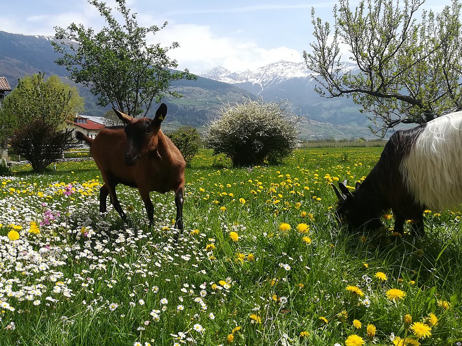 Eine beneidenswerte Rundumsicht in das sonnenverwöhnte Tal und auf die umliegenden Bergspitzen erwartet Sie in unseren drei kleineren Ferienwohnungen im 1.Stock und in einer größeren Panorama Wohnung im 2. Stock.